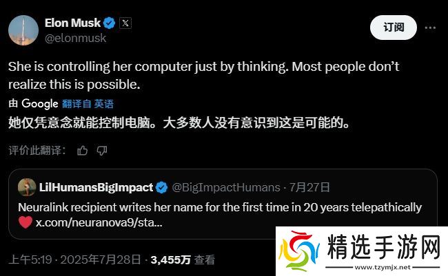 另一位 X 用户引用她的帖子写道:“Neuralink 受益者通过心灵感应首次在 20 年后写下自己的名字。”对此,Neuralink 创始人埃隆・马斯克转发该帖子并表示:“她仅通过意念就能控制电脑。大多数人没有意识到这是可能的。”