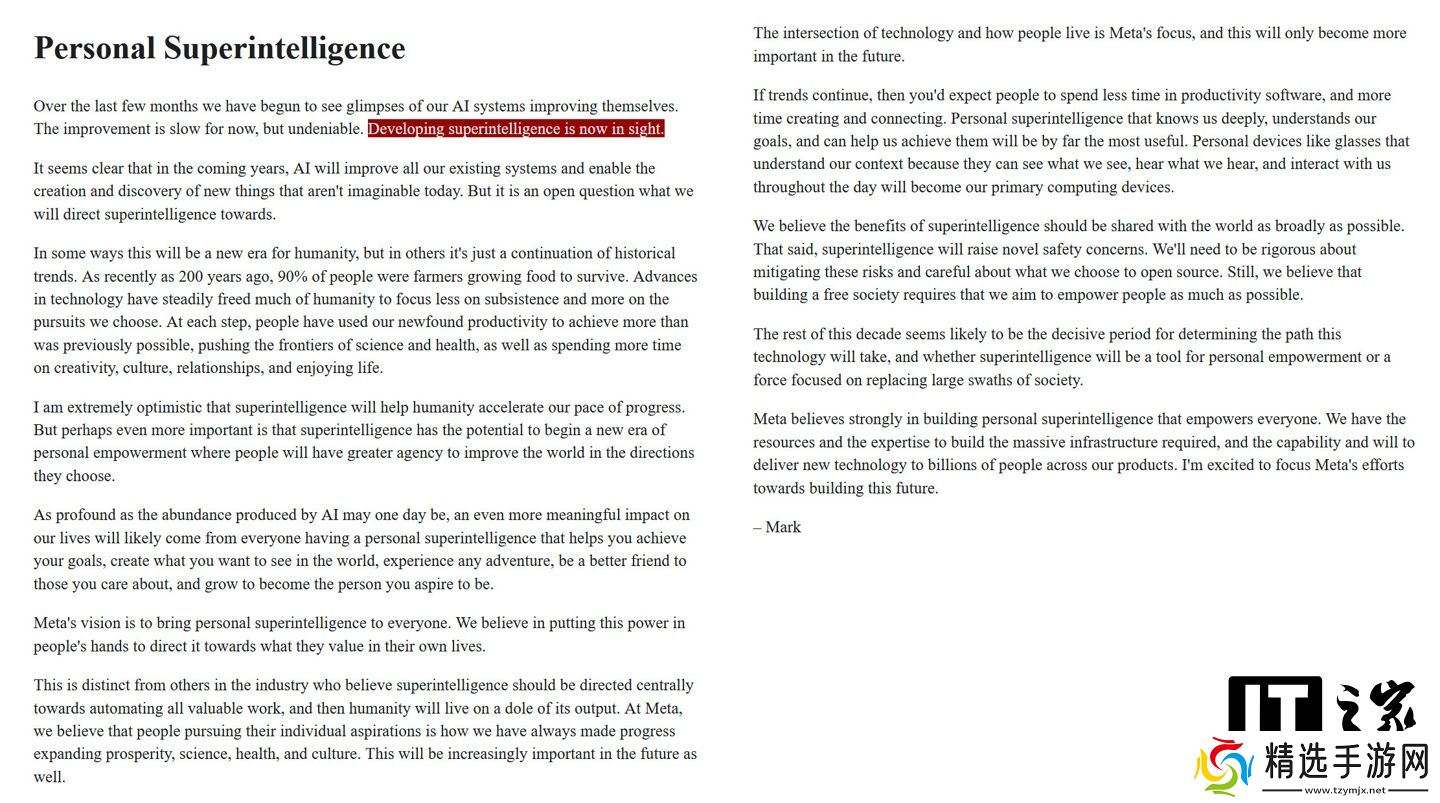 扎克伯格在一份声明中指出,过去几个月 Meta 的人工智能系统已经开始展现出自我改进的迹象,这使得超级智能的开发已经近在眼前,他强调:“Meta 的愿景是将个人超级智能带给每一个人。我们坚信,将这种强大的力量交到人们手中,让他们能够将其用于自己生活中所重视的事物,这是十分重要的。”