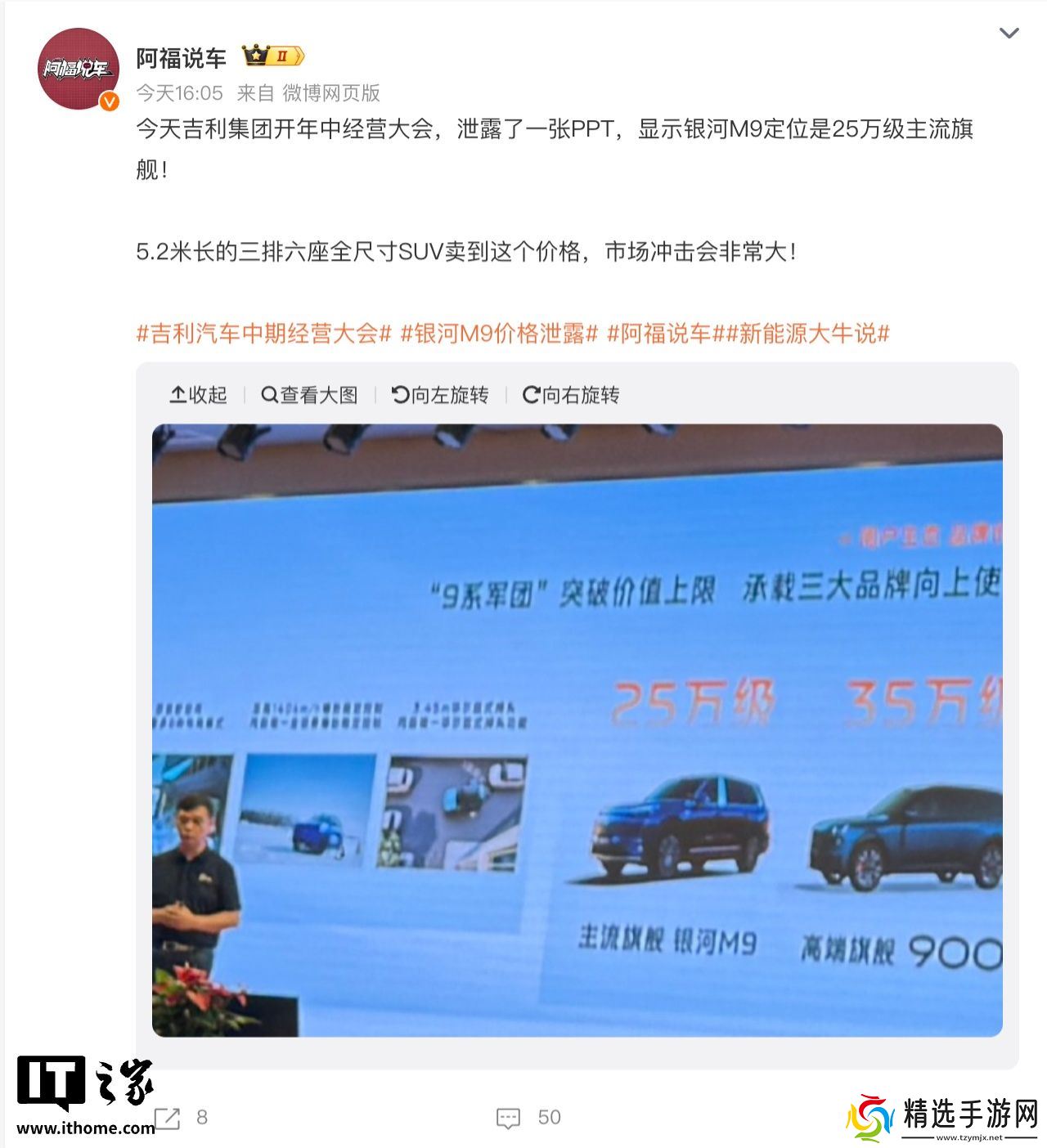 本站 7 月 30 日消息,吉利集团今天召开了年中经营大会,现场 PPT 展示了吉利的“9 系军团”,除了已经上市的领克 900 外,另一款中大型 SUV 新车 —— 银河 M9 的售价信息也一并曝光:25 万元级别,定位为“主流旗舰”,明显低于领克 900 的“高端旗舰”。
