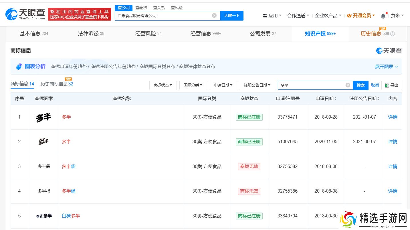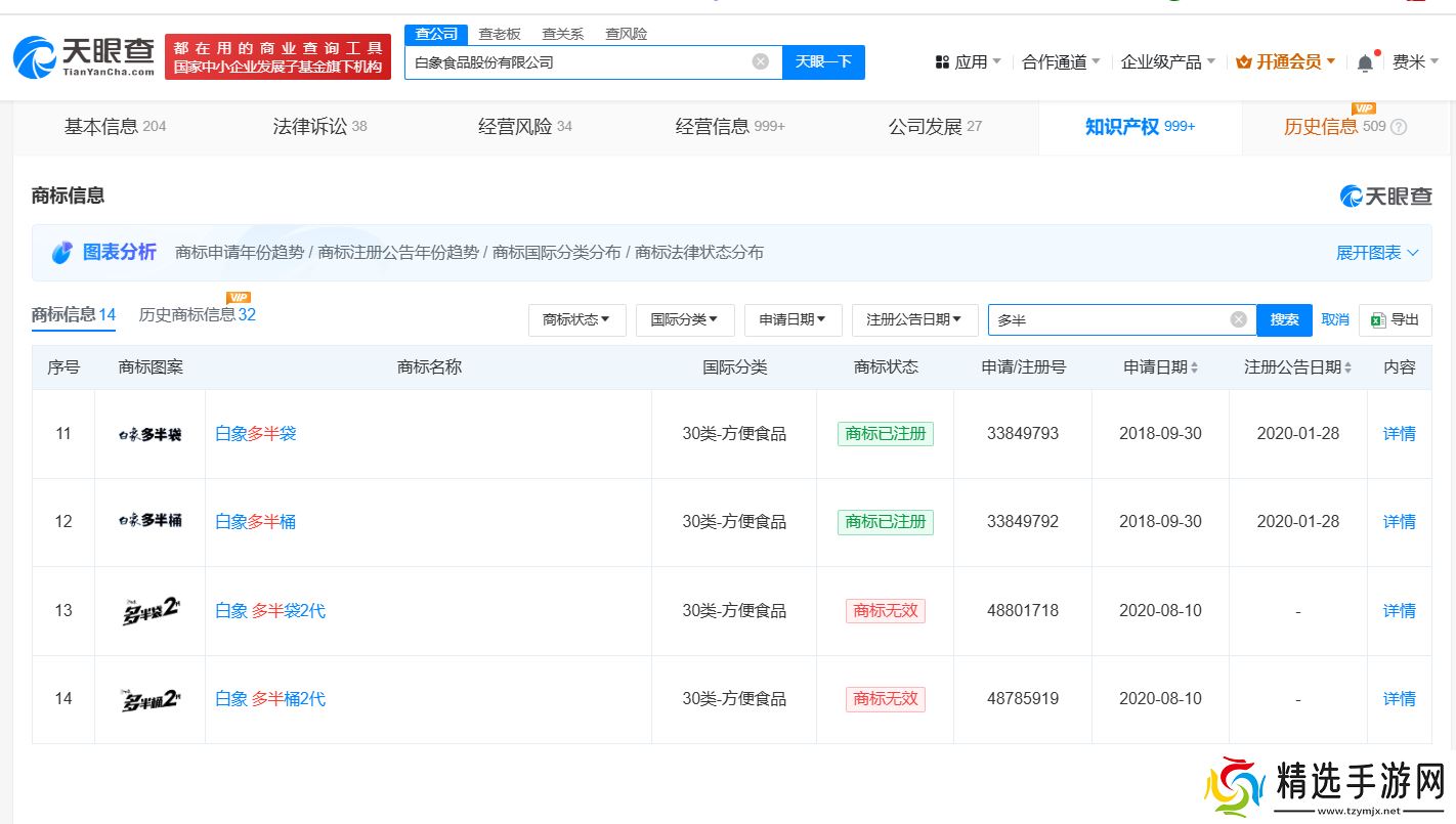 据天眼查知识产权信息进一步揭示,白象食品股份有限公司自2018年至2021年间,积极申请注册了包括“多半”、“多半袋”、“多半桶”、“白象多半袋”以及“白象多半桶”在内的多个商标,这些申请均归类于方便食品领域。目前,部分商标已成功注册,获得了法律保护。
