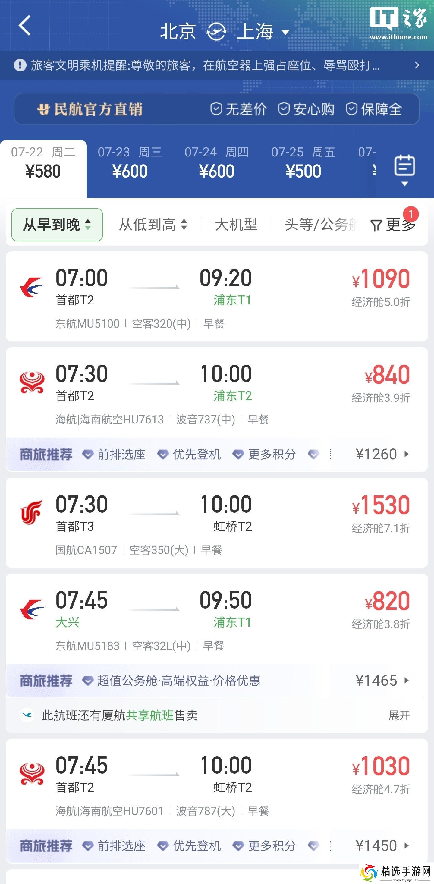 本站参考相应视频获悉,在航旅纵横民航官方直销平台上,该航班经济舱价格为 600 元起;在携程上,经济舱价格最低为 580 元起;而在飞猪平台上,该航班经济舱最低报价仅为 532 元(也就是航旅纵横贵了约 12.78%)。而在东方航空 App 上,该航班的价格与航旅纵横相同。