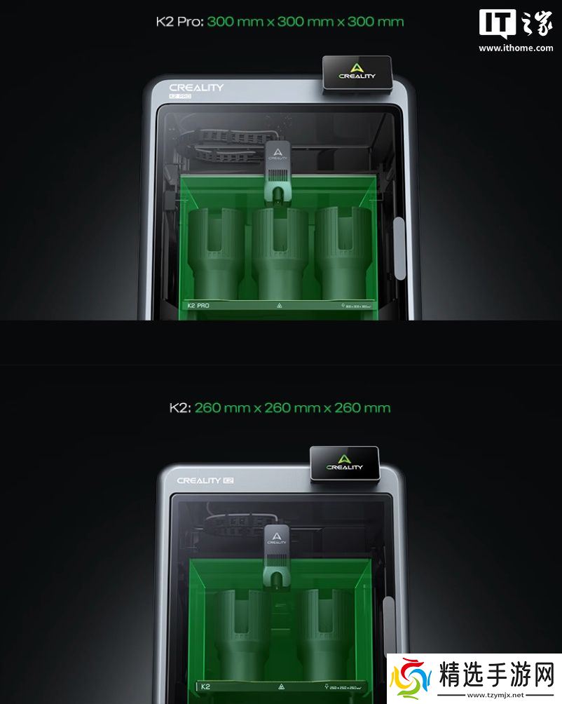 据介绍,K2 Pro 相对于 K2 的区别主要是打印尺寸更大,其中 K2 Pro 可以打印 300x300x300mm 物品,而 K2 可以打印 260x260x260mm 物品。其他方面,K2 Pro 可提供(60 度)主动腔体恒温、流量校准功能,同时内置 32GB 存储空间,额外支持 ASA / PA-CF / PPA-CF 耗材。