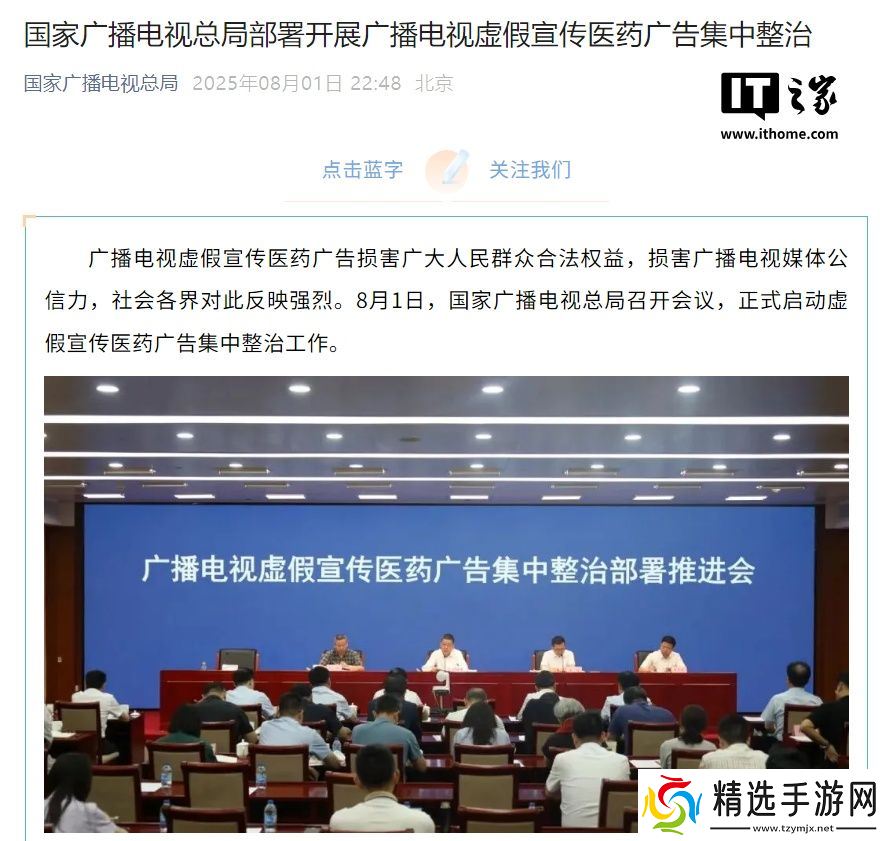 本站 8 月 1 日消息,广播电视虚假宣传医药广告损害广大人民群众合法权益,损害广播电视媒体公信力,社会各界对此反映强烈。8 月 1 日,国家广播电视总局召开会议,正式启动虚假宣传医药广告集中整治工作。