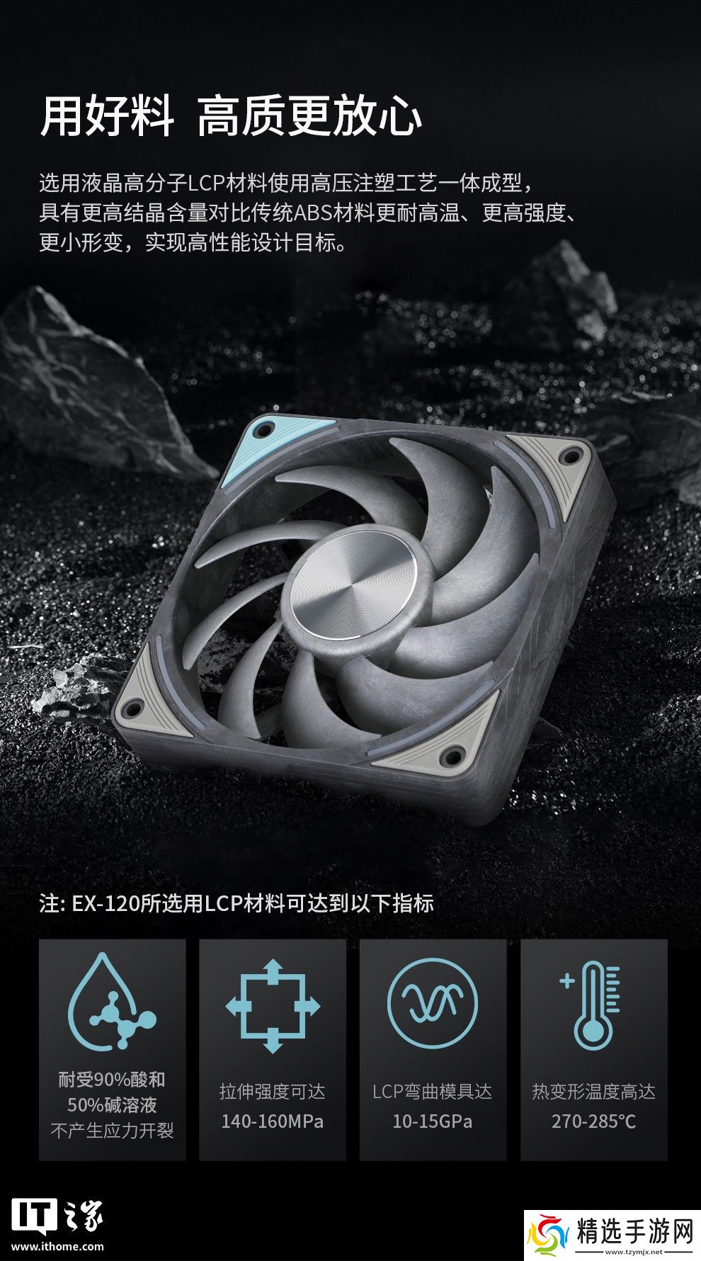 京东鑫谷 EX-120 风扇 99 元直达链接本站注:LCP 液晶聚合物以其高刚性、高抗拉强度、低蠕变的特性被视为良好的风扇制造材料。如今,越来越多的 PC 散热企业开始在高端风扇产品线中使用 LCP。