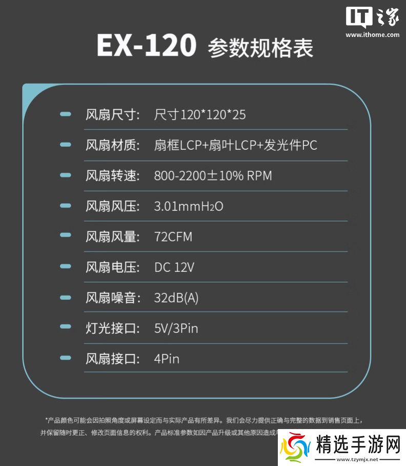 据介绍,鑫谷 EX120 风扇为 LCP 材料原生适配设计,拥有 9 片“风镰”扇叶,搭载具备双层防尘结构的 FDB 轴承,整体经过动平衡校准,使用寿命 4 万小时,扇框配备了同等寿命的简洁光效 ARGB 灯珠。