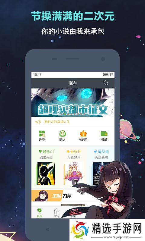 这是一款专为二次元文学爱好者打造的阅读软件,其中不仅有海量原创宅文、各式同人文、动漫穿越、异界幻想、游戏世界和超现实都市等类型的二次元小说,还有独特的画风和丰富的内容,能满足各种需求。此外,软件内置的小说弹幕功能让用户可以在阅读过程中自由讨论和吐槽,增加了阅读的乐趣。