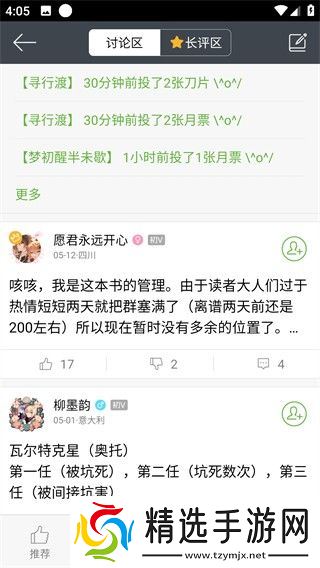 3、点击书评区,然后选择具体书本的书评,点击即可进入,此页面皆为欢乐书客app用户的全新阅读体验与讨论交流,分为讨论区与长评区;