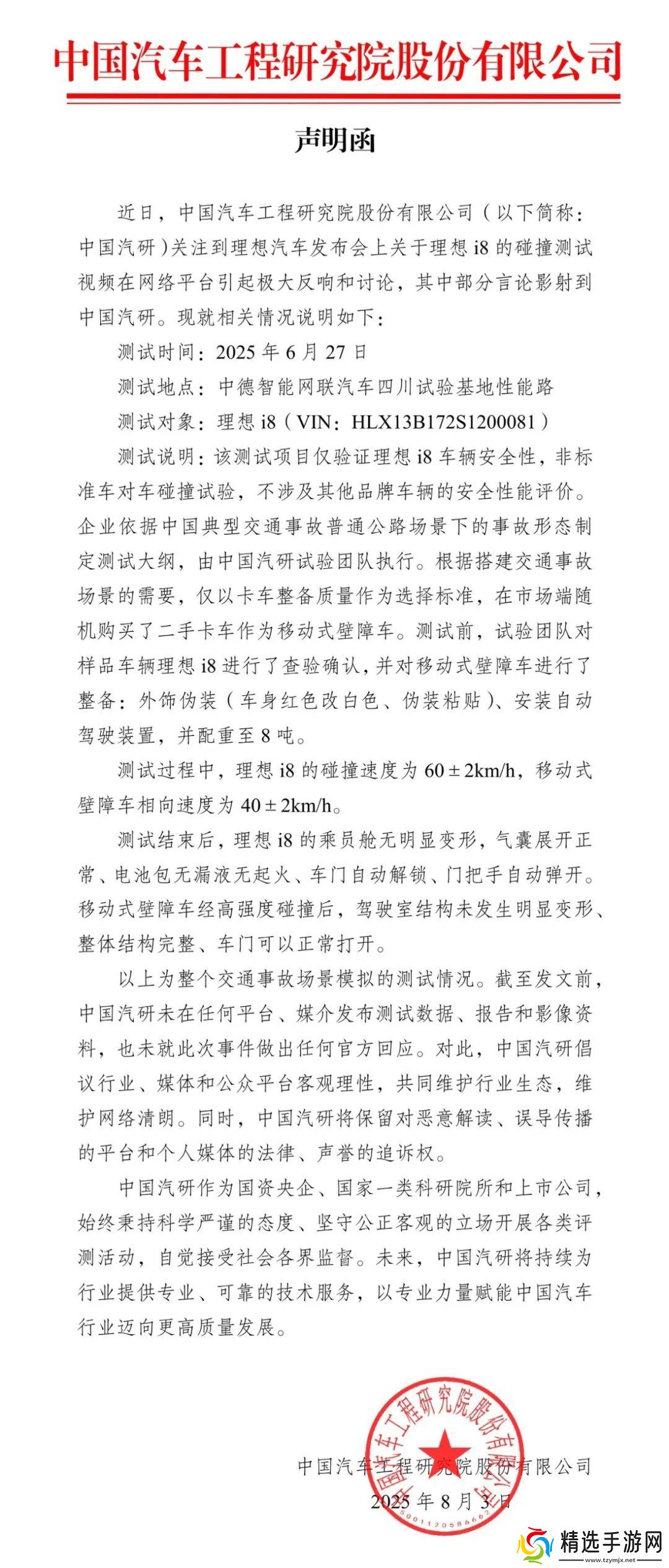 本站 8 月 3 日消息,中国汽研今晚发布《声明函》,回应了理想汽车发布会上关于理想 i8 的碰撞测试争议。