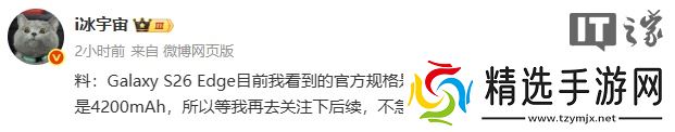 本站 8 月 4 日消息,博主 @i冰宇宙 今日爆料称,三星 Galaxy S26 Edge 目前看到的官方规格是 4400mAh,但是供应链那边显示是 4200mAh。不过,该博主也提到再去关注下后续,不急下结论。
