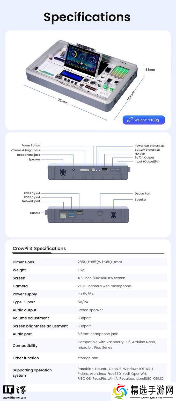 CrowPi 3在硬件配置上颇具亮点,内置了一块4.3英寸的IPS触控屏,分辨率达到了800x480像素,为用户提供了清晰的视觉体验。它还配备了扬声器和200万像素的摄像头模块,摄像头内置麦克风,能够满足多样化的使用需求。整机重量控制在约1.1Kg,便于携带与操作。