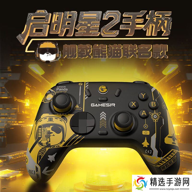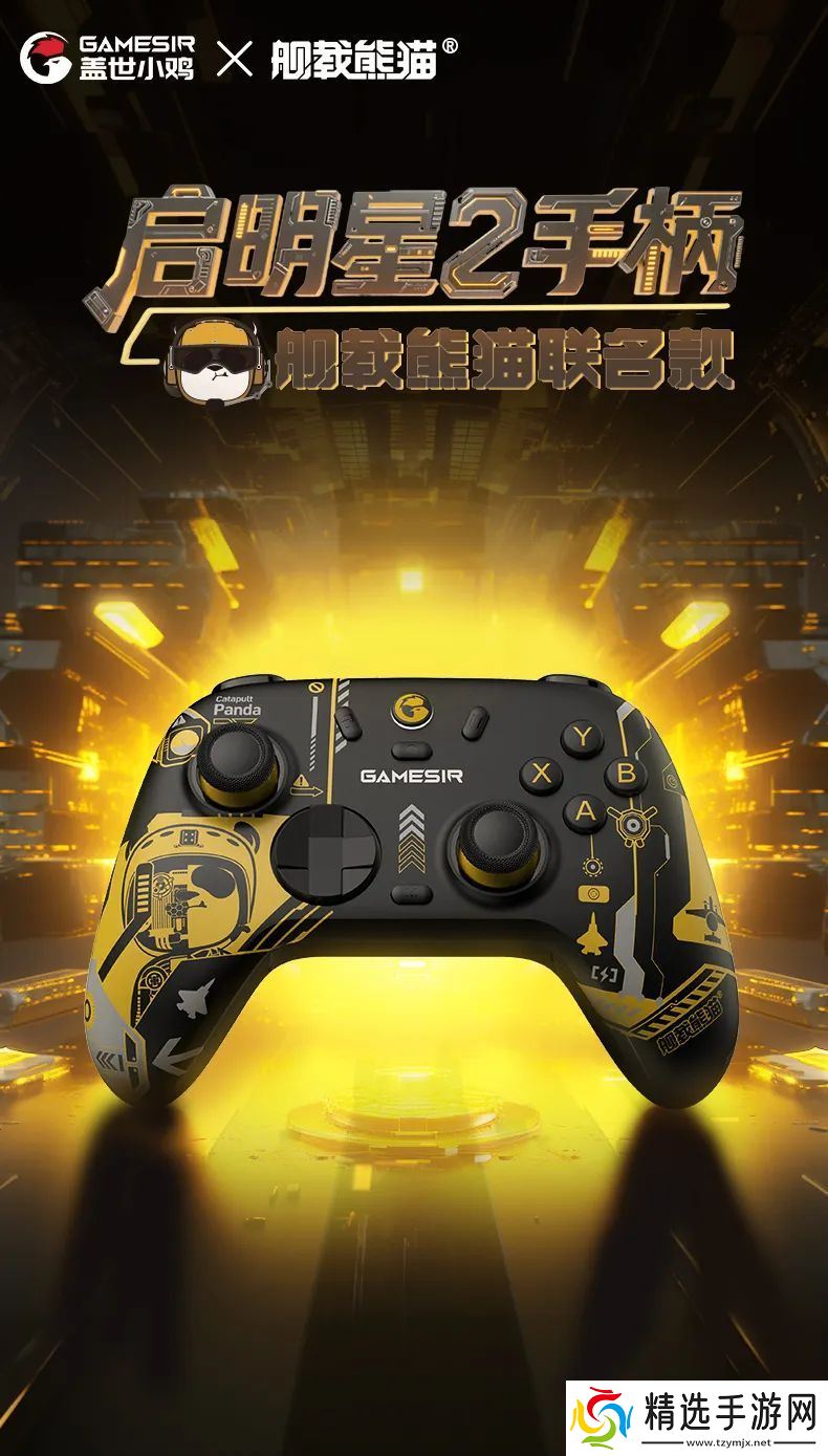 舰载熊猫联名款:舰载熊猫的设计,是以中国航母舰员和飞行员作为灵感,一改传统熊猫创作的萌系风格。舰联名款里身穿帅气黄马甲的舰载熊猫,就是舰上的指挥员,通过使用特有手势去传递信号。手柄本体采用沉稳的黑为主色调,辅以“明星”战位黄马甲色调,手柄侧面的熊猫头戴金色的飞行头盔。