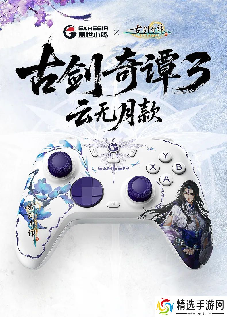 《古剑奇谭 3》联名款:以仙侠奇幻题材为核心,定制云无月主题。在白色的基调上,采用云无月标志性的蓝紫色,呼应角色的清冷气质。中间印刻的辟邪族纹,梦蝶飞舞环绕。左握把处刺荆心花缠绕,《古剑奇谭 3》的标志点缀其中;右握把呈现经典主角云无月形象。