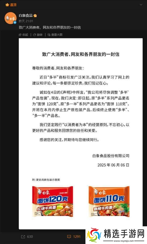 6月4日,白象食品首次就此事发表声明。紧接着,6月6日晚,白象食品再次通过其官方微博发布消息,宣布即刻起对“多半”和“多一半”系列产品进行更名。公司计划在6个月内停止生产原包装产品,并最终终止使用“多半”和“多一半”这两个产品名。