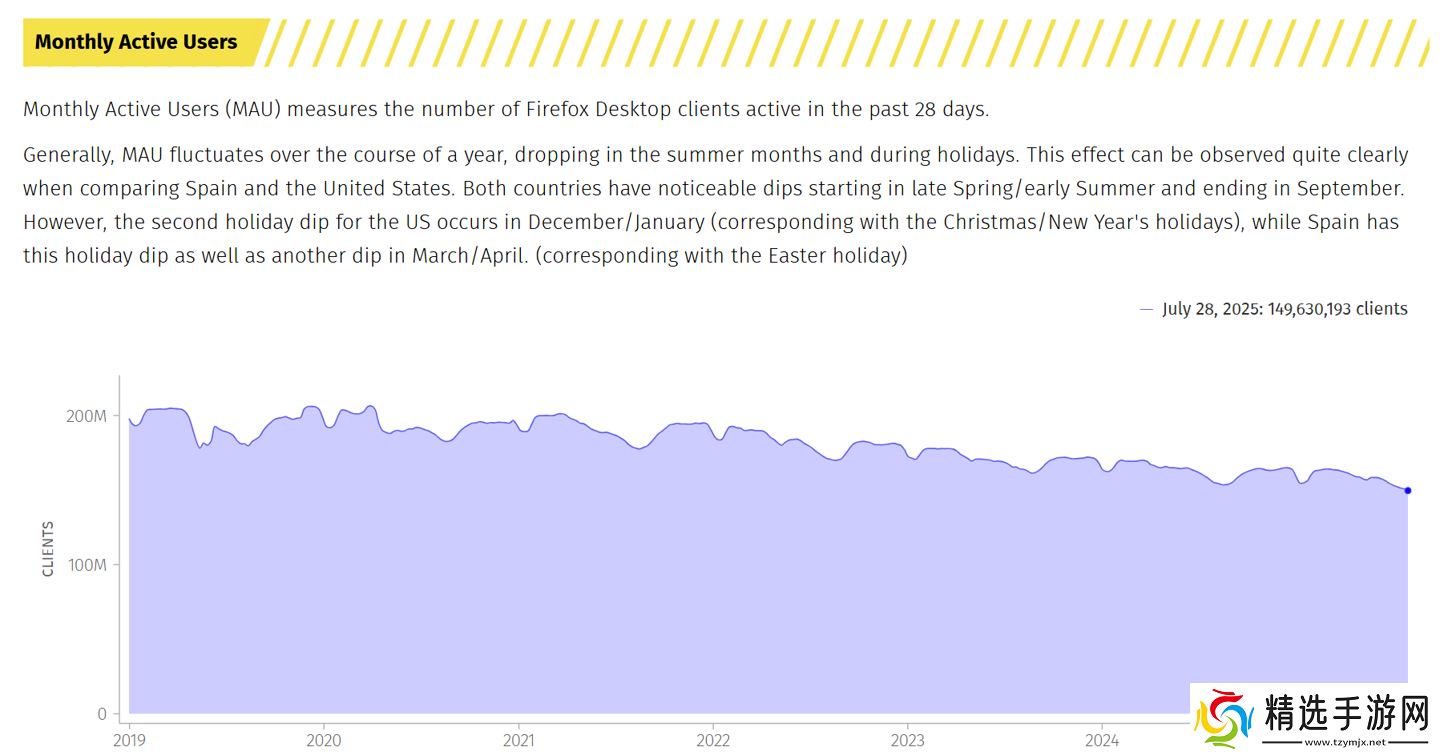 本站 8 月 7 日消息,根据官方统计数据,2025 年第 31 周(7 月 28 日周一开始计算),火狐 Firefox 浏览器的全球周活跃用户数量首次跌破 1.5 亿,活跃用户数据为 149630193。