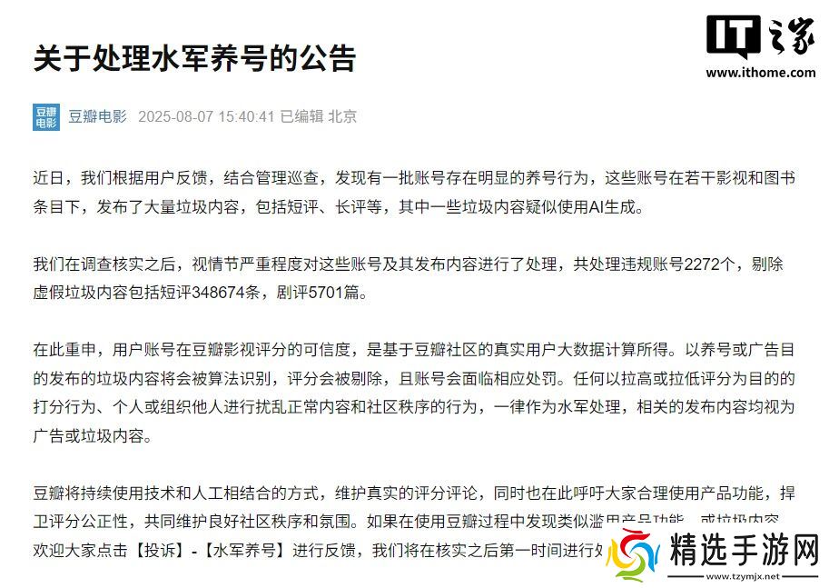 本站 8 月 7 日消息,豆瓣电影官方今日发布关于处理水军养号的公告,本站附全文如下: