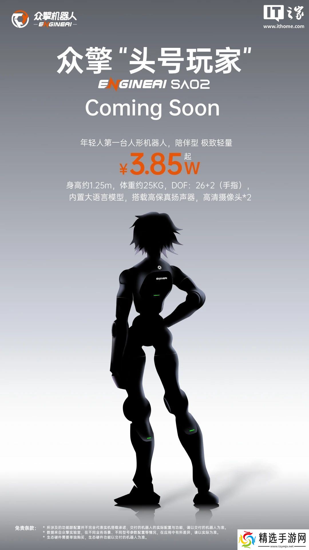 从海报可以看到,该机器人采用细长身材设计(可能有头发),身高约 1.25m,体重约 25kg,拥有 26+2(手指)自由度,内置大语言模型,搭载高保真扬声器,2 个高清摄像头,主打陪伴,售价 3.85 万元起。
