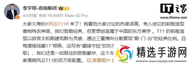 本站 8 月 8 日消息,奇瑞汽车执行副总裁今日公布了风云 T11 增程 SUV 外观海报,并预告将揭晓“百万级配置”。