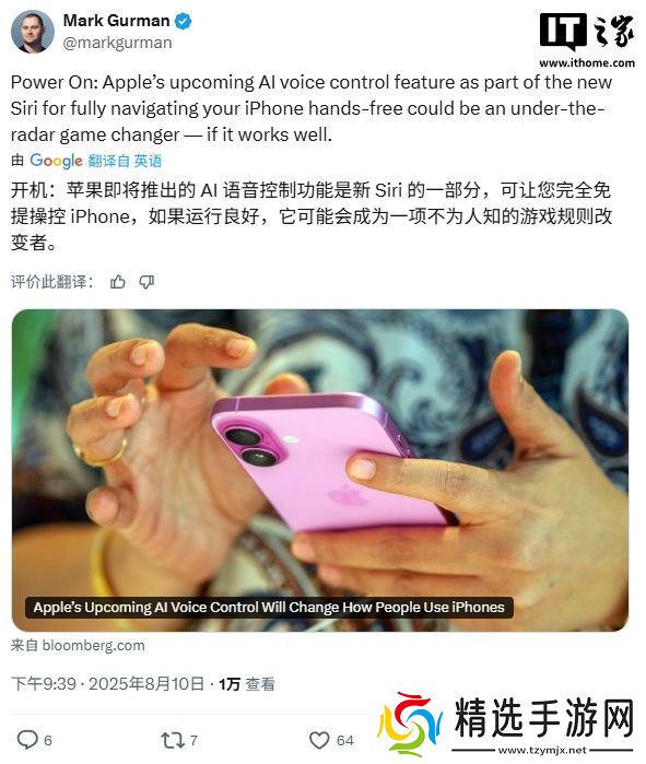 本站 8 月 10 日消息,彭博社记者马克・古尔曼今晚发布了最新的 Power On 时事通信,他表示苹果正测试一项全新的 Siri 功能,旨在让 iPhone 用户仅凭语音即可完成精准操作。如果一切顺利,它可能会改变游戏规则。