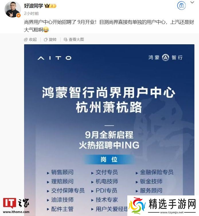 本站 8 月 11 日消息,据博主 @好波同学 透露,鸿蒙智行“第五界”的尚界用户中心开始招聘,9 月开业,“目测”直接有单独的用户中心。