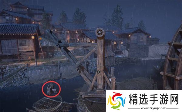 乘船出发,抵达后穿过房屋,遇到一对母子,按下按钮启动水龙头喷水,使用太极将水射到水车上以启动机关。