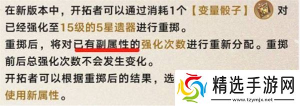 变量骰子可以重置已强化到15级的遗器的强化词条,随机分配新的强化词条。这意味着玩家可以在不改变遗器初始词条的情况下,尝试获得更符合自己需求的强化效果。