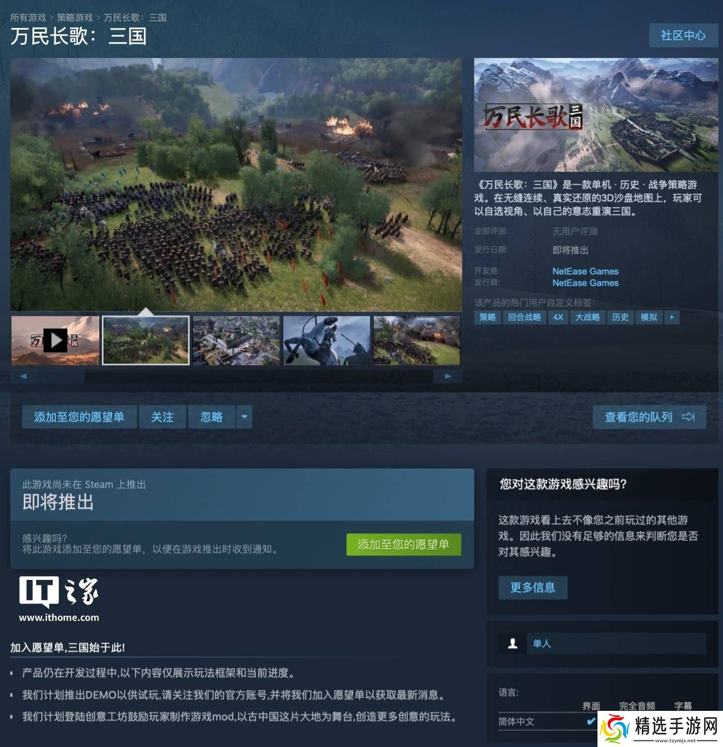 在Steam平台上,一款由网易《率土之滨》团队匠心打造的历史战争策略单机游戏《万民长歌:三国》正式亮相,吸引了众多玩家的目光。这款游戏以三国时期为背景,声称能让玩家在无缝连接的3D沙盘地图上,依据自己的意志重现那段波澜壮阔的历史。