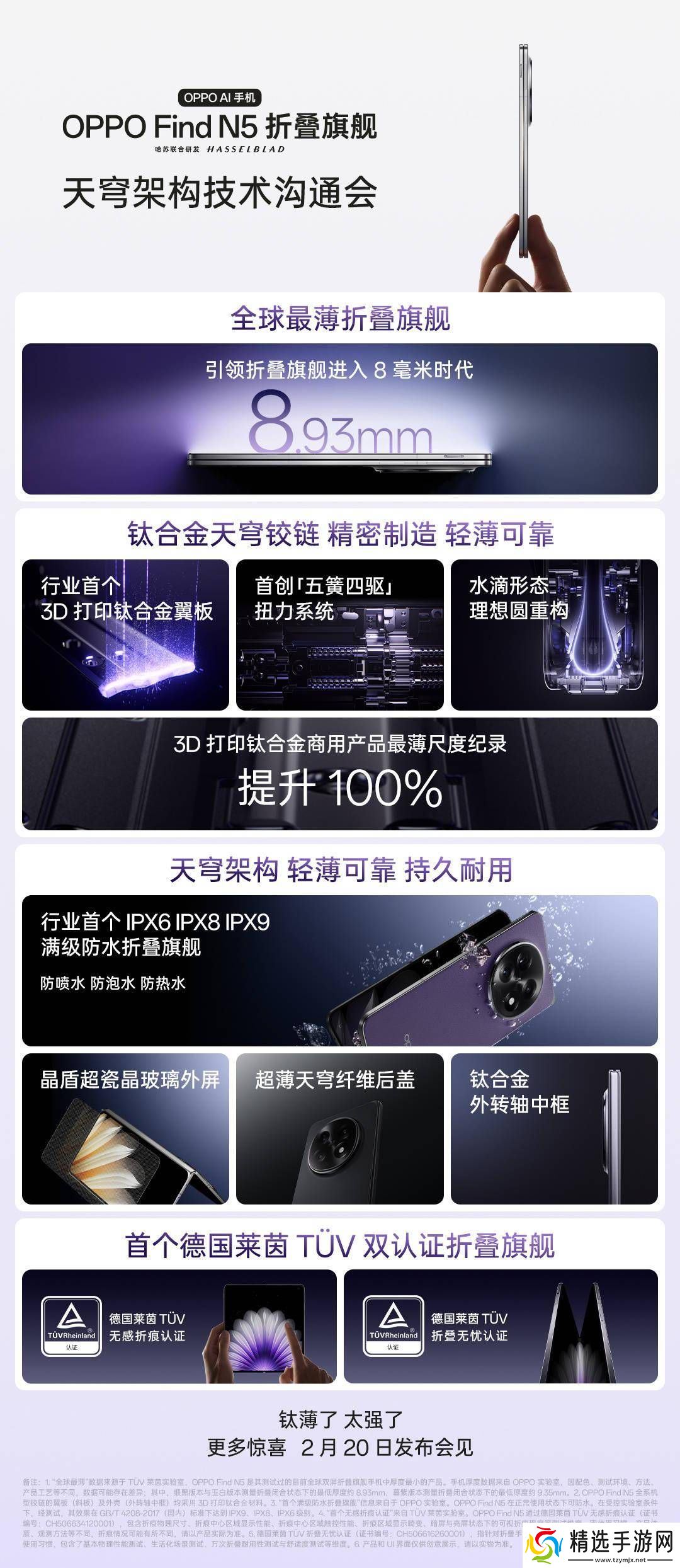 OPPO即将于2月20日19时全球首发其最新的折叠旗舰手机——Find N5。这款备受瞩目的新机在设计上实现了诸多突破,尤其是其超薄机身,据官方数据,缎黑与玉白配色的Find N5厚度仅为8.93mm,而暮紫配色则稍厚,为9.35mm。