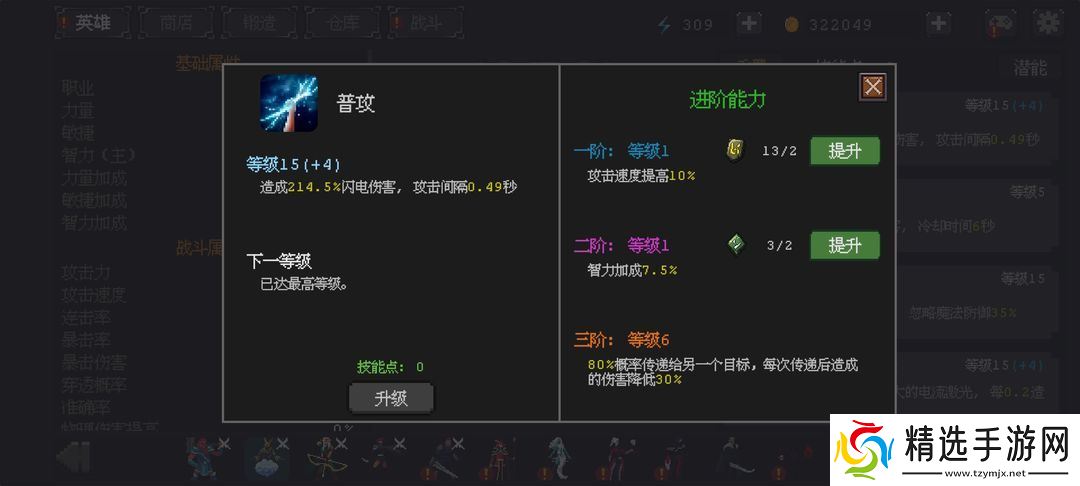 每个技能最高升到15级,每5级解锁一个进阶,需消耗灵石升级。