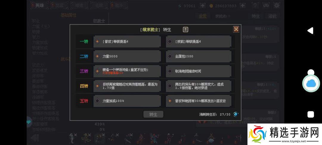 每个英雄达到60级后开放转生,需要消耗转生石,按转生次数分别消耗5,10,15,20,25个,英雄将回到1级,获取额外的基础属性和转生词条。转生词条2条线可以随意选择与更换,所以无需反复询问转生选择那条,不同时期选择不一样,自己打桩试试就行。注:无尽无经验。
