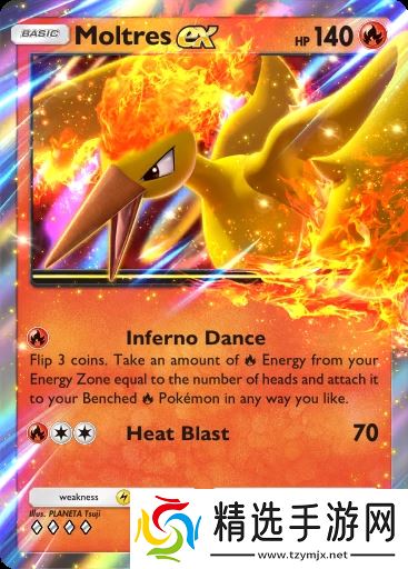 火焰鸟EX:1能量的火焰之舞可以随机给后备宝可梦提供0-3点火能量,火属性控制卡组核心,喷火龙EX卡组必须的充能手,推荐相关卡组满编2张。