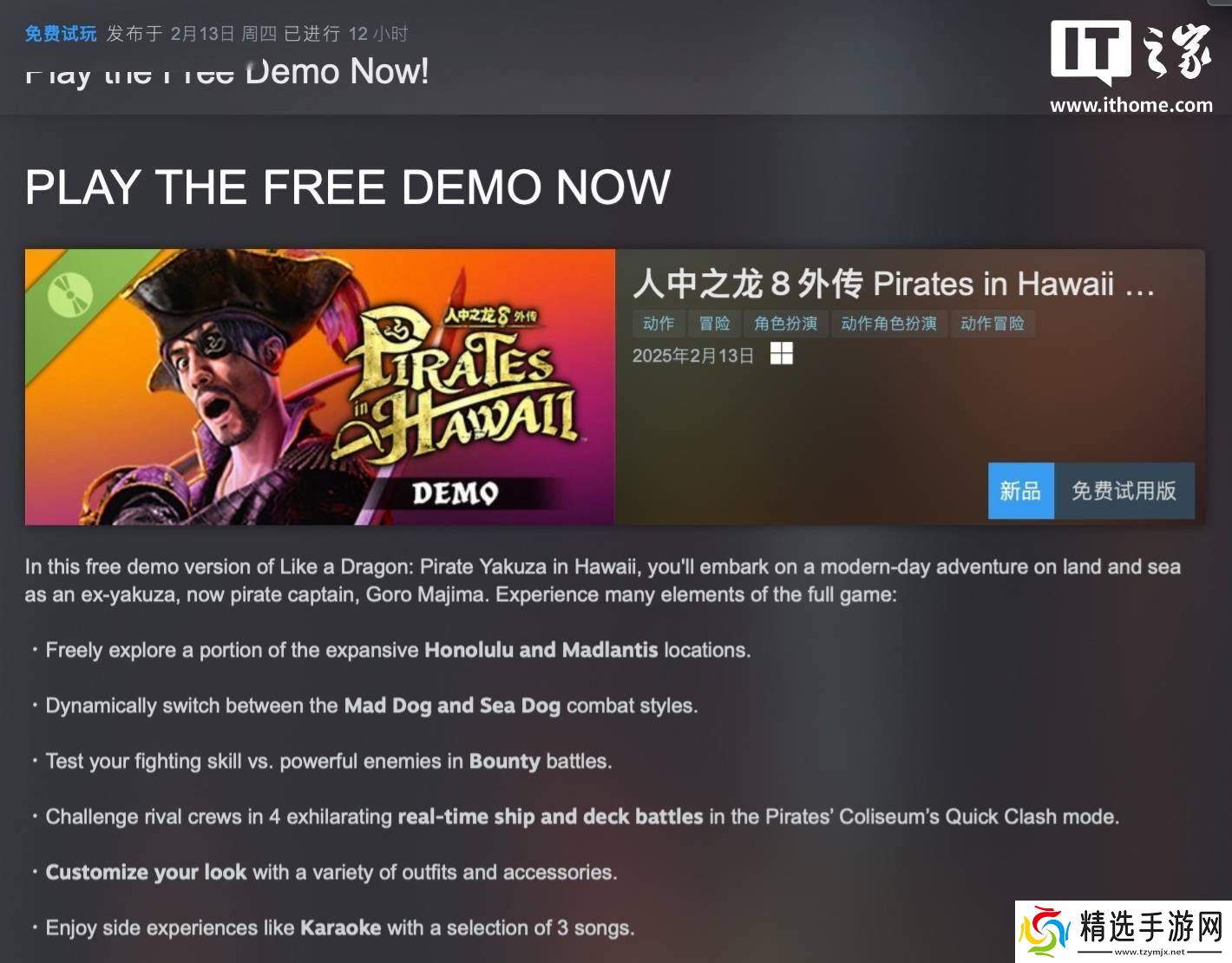 《人中之龙 8 外传:夏威夷海盗》现已开放免费试玩,让玩家抢先体验檀香山与虚构都市马德兰蒂斯的魅力风光。此次试玩版本中,玩家能够探索游戏的部分区域,亲身感受全新战斗系统的刺激,参与四场紧张激烈的船舰与甲板对决,并在卡拉 OK 模式下尽情欢唱三首歌曲。