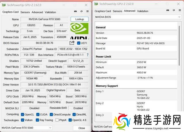 通过GPU-Z截图,我们可以看到RTX 5080 AMP EXTREME的加速频率为2670MHz,TDP为360W,但可以通过超频软件提升至400W。尽管在频率上仅比公版高出52MHz,但其在游戏中的实际表现却远超公版。