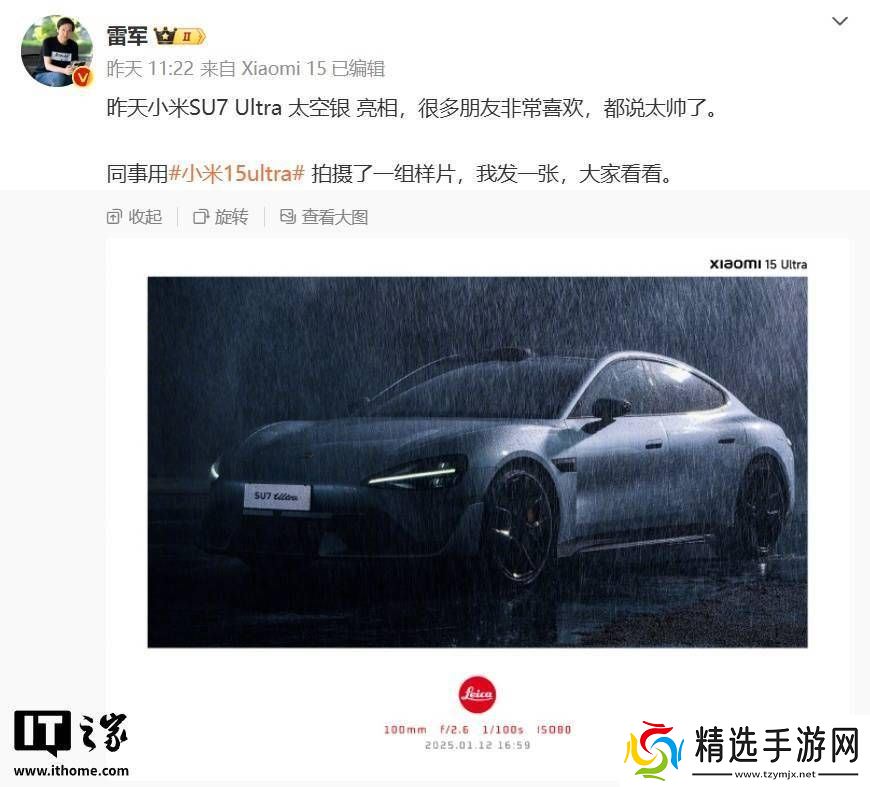 雷军,小米公司的创始人、董事长兼首席执行官,近日在个人社交媒体上分享了一张由小米15 Ultra手机拍摄的SU7 Ultra汽车样张。这张图片不仅展示了小米15 Ultra的摄影实力,还意外泄露了该手机将引入的新型水印样式。