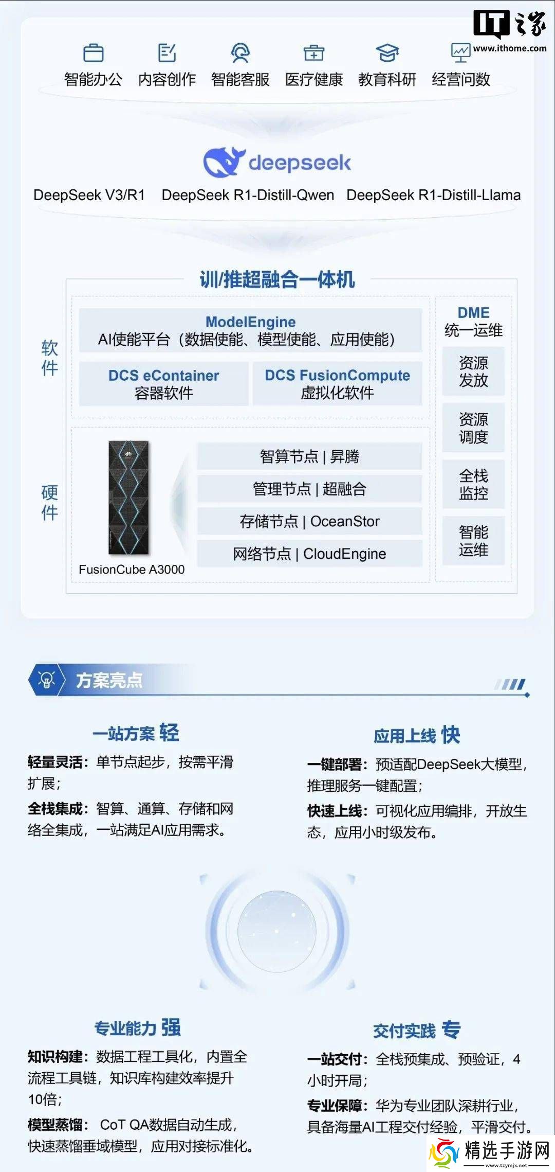 FusionCube A3000作为华为DeepSeek训推超融合方案的载体,具备多重显著优势。其设计轻巧灵活,企业可以从单节点开始部署,根据实际需求逐步扩展规模,无需担心初期的投资压力。全栈集成则是另一大亮点,智能计算、通用计算、存储以及网络资源全部集成于一体,全面满足AI应用的多样化需求。