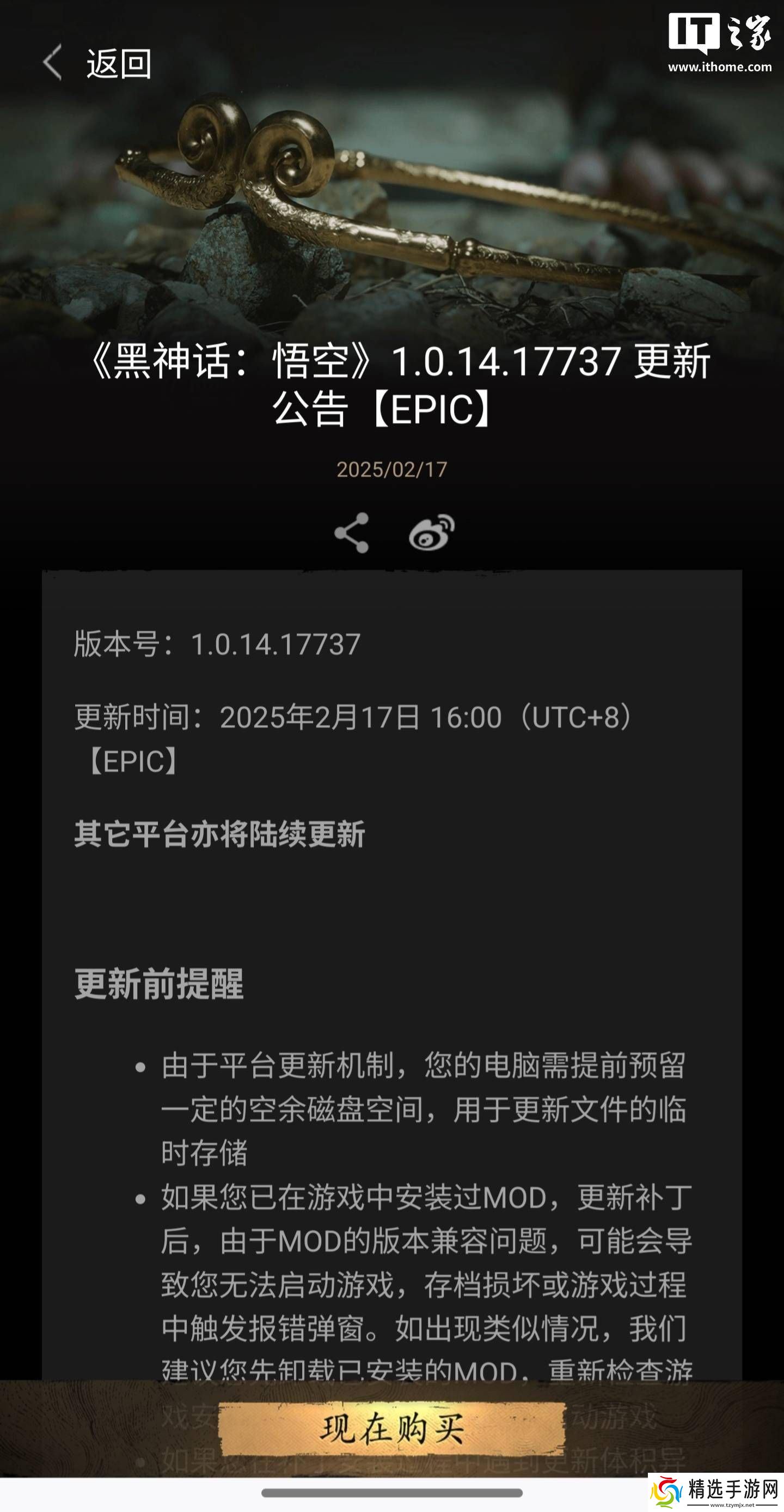 近日,《黑神话:悟空》游戏在Epic平台悄然上线了1.0.14.17737版本更新,该更新于前日傍晚4点正式推送,其他游戏平台也将紧随其后,陆续迎来此次更新。