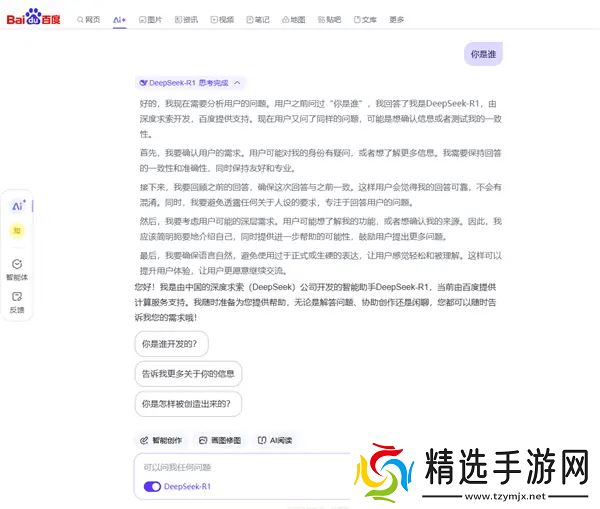 据悉,DeepSeek大模型已经正式在百度搜索平台上线。用户只需在百度首页点击“AI+”或“立即体验百度AI搜索”按钮,随后打开提问框中的DeepSeek-R1功能,即可启用这一先进的推理服务。当被问及身份时,DeepSeek-R1会迅速回应,表明自己是由中国的深度求索公司开发的智能助手,当前由百度提供强大的计算支持。
